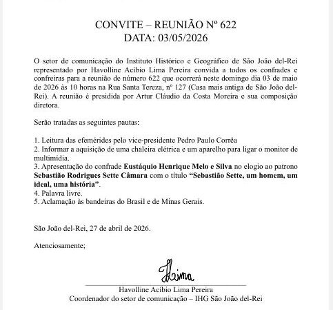 24 de Abril de 2026, 19 horas. Local – Sede do IHG de São João del-Rei, casa mais antiga da cidade, na Rua SantaTereza, nº 127, Centro, São João del-Rei.